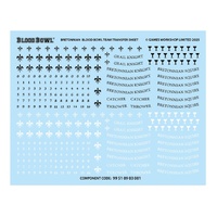 This kit is supplied with a Bretonnian Blood Bowl Team Transfer Sheet, featuring 320 high-quality waterslide transfers. These include fleur-de-lys and grail icons, role identifications, and numbers for you to decorate your miniatures.