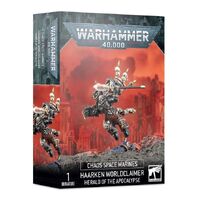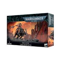 This multipart kit builds Angron, Daemon Primarch of Khorne – the eternal master of the World Eaters Legion. This imposing warrior towers head and shoulders above most miniatures on the battlefield, including his own frenzied sons amongst the World Eaters. He's armed with his massive chainaxe, Spinegrinder, and the brutal rune-etched daemon sword known as Samni’arius – both weapons chained to his wrists in true Nucerian style. His warped form is festooned with grisly trophies and World Eaters iconography, with a barbed club-tail whipping behind him, shadowed by a pair of sinister spiked wings. Even his base is littered with skulls, as his hooved feet mount a broken rocky outcrop.