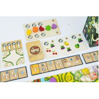 Alpujarras is a turn-based game in which players move their mules around an action track outside the game board. The player who is furthest behind takes the turn and moves their mule to an action space to perform an action.