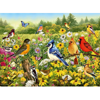 Write a reviewImmerse yourself in the serene beauty of nature with the Ravensburger Birds in the Meadow 500pc Jigsaw Puzzle. This captivating puzzle showcases a vibrant wildflower meadow teeming with a variety of colorful birds, including the Blue Jay, Downy Woodpecker, Eastern Bluebird, Ruby-Throated Hummingbird, Red Cardinal, and the rare Northern Yellow Cardinal. Each bird is depicted in exquisite detail, capturing the essence of a lively springtime scene.