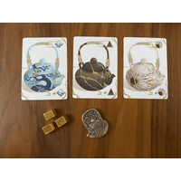 In Broken and Beautiful, players draft cards like bowls, cups, and tea jars to create high-scoring sets. As some pieces inevitably break, players must judiciously repair what has been shattered.