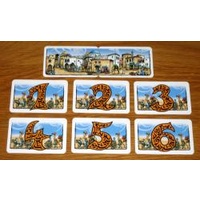 Following rounds are played the same way until all goods have been auctioned. Players can also sell sets consisting of exactly 3 cards of the same good from their hands whenever they want. That is no real sale but players hold the highest card of each set for scoring. Merchant cards can be used as a joker - even two merchants are allowed in a set of 3 goods. Although merchant cards have a value of 0, a set of 3 merchants will score 5 points!