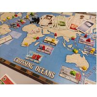 Crossing Oceans picks up the theme and some elements of the 2017 released board game Transatlantic, composing a new game on a large historical map of the world.