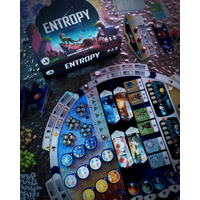 Entropy plays out over a variable number of rounds. Each turn, you must move your Scientist between 1 to 3 spaces clockwise around the Main board. You must end your movement on either an inner Action space on the Main board or an outer space of an Action tile, and resolve it. You will build Solar Systems with Stars, Planets, and Asteroids, then fill them with Life, by playing cards. You may also gain various special abilities by adding Biomes and upgrading your Console.
