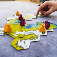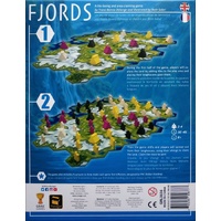 Fjords is a tile-laying game that takes place in two phases. First, the players explore the fjords around them by laying hexagonal landscape tiles. Second, beginning from the encampments placed during phase one, players will walk the landscape, claiming as much of the plains and cliffs as possible.