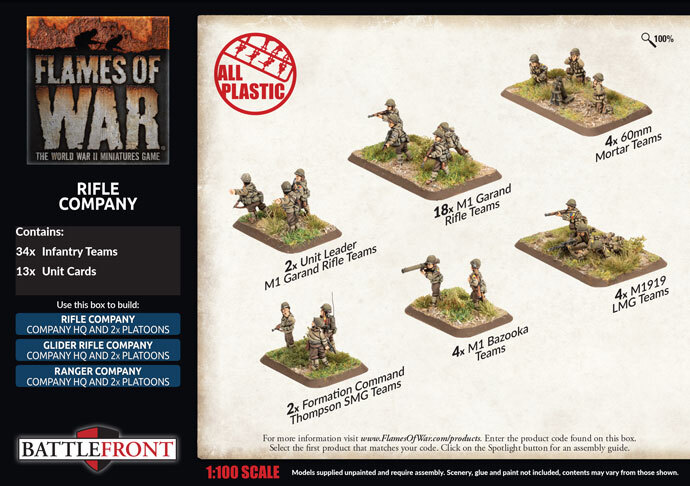 includes two Plastic Formation Command Thompson SMG Teams. two Unit Leader M1 Garand Rifle teams , four M1 Bazooka Teams, four M1919 LMG Teams, four 60mm Mortar Teams, eighteen M1 Garand Rifle Team, and thirteen Unit cards.