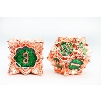 The Floral Starburst: Emerald Caladium Metal RPG Dice Set is perfect for druids, rangers, nature-aligned spellcasters, or players who appreciate premium materials and expressive design. Bring verdant beauty and authoritative weight to every roll with this standout metal dice set.