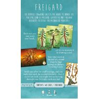 Freigard is a deceptively simple game of risk taking and hand management: each turn you have the choice between scoring (if possible) your hand of 3 cards, or draw one extra card (then discard one) in order to improve your hand. If you’re too greedy, you risk burning through your deck too fast, but settling down too often might not get you the powerful army you need to defeat the strongest Walking Castles…