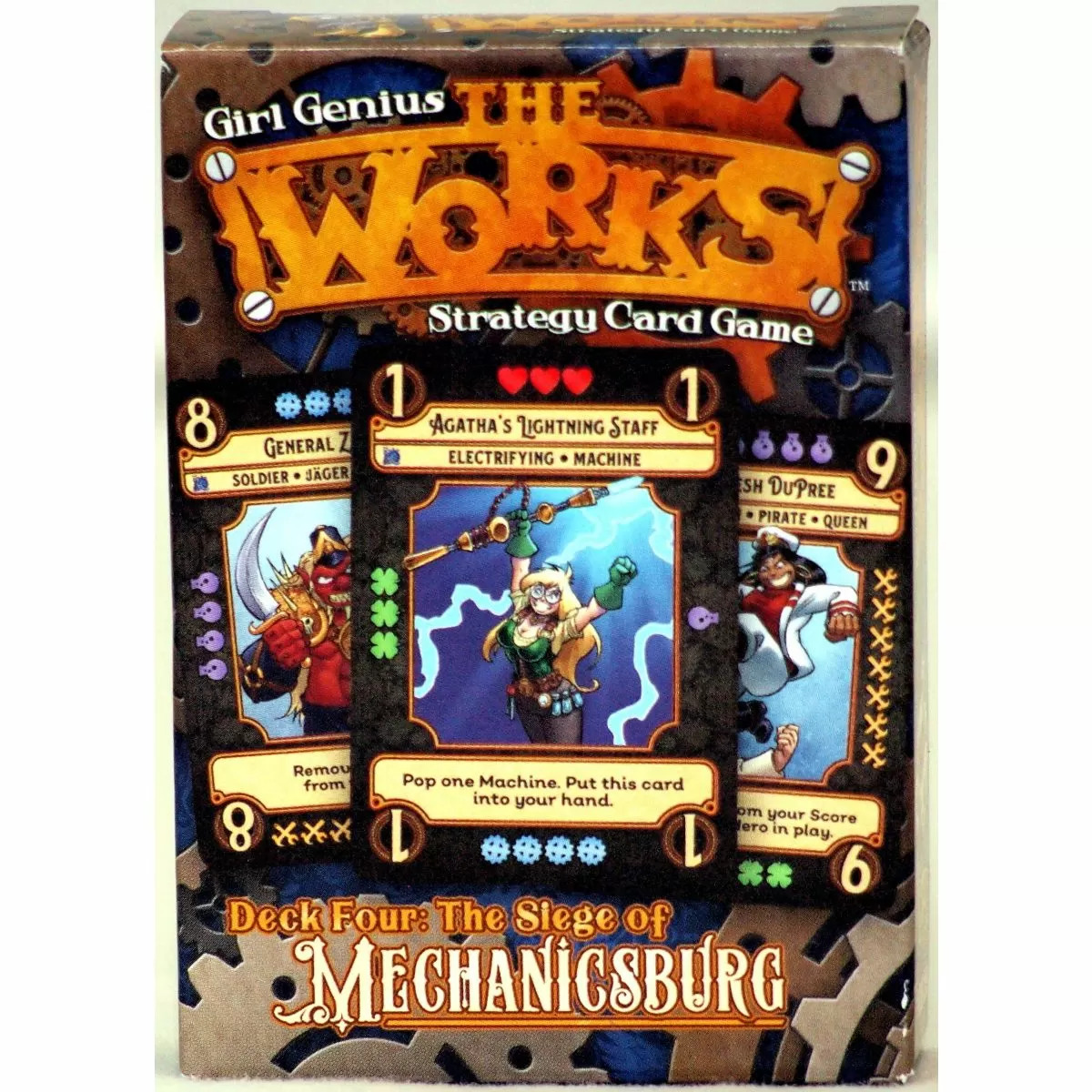 Girl Genius: The Works is a non-collectible card game that consists of several standalone decks of cards. You can play the game with any one of those decks, while also being able to combine some or all of those decks into a single deck for a longer game or a game with more players. Each deck contains many unique cards, but the gameplay is the same in all cases.