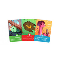 You will work to avoid all of life’s little disasters and laugh as they happen to your friends. If you collect 3 Disaster cards of the same type OR 3 different types of Disaster cards, you will be out of the game. Point cards feature weapons, trinkets, and good luck charms that you use to collect points and avoid disasters. Each card has a point value between 0 and 9 that you will use when scoring a round. You can use Instant cards at different points during the game to tip the odds in your favor or save your Dinosaur from certain death.