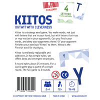 Write a reviewKiitos is a fast-tempo, card-based word game with novel, simple rules and deep, emergent game play. Can you make a word with the letters in your hand, and what letters that may or may not be in your opponents’?
