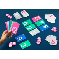 Fives is a trick-taking game for three or four players. The reverse side of the cards shows a magenta 5.