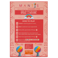 Mantis is a fast, colourful, and cutthroat card game of steals, combos, and revenge — created by the team behind Exploding Kittens. Designed for 2 to 6 players and playable in under 15 minutes, Mantis blends bright visuals with bluffing, light strategy, and moments of outrageous luck that will have players laughing and yelling from the first turn.