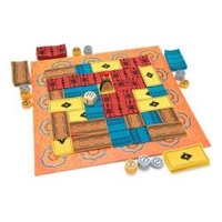 On your turn, you may rotate Assam 90 degrees. Then roll the die and move him forward as many spaces as showing (d6: 1, 2, 2, 3, 3, 4). If Assam reaches the edge of the board, follow the curve and continue moving in the next row. If Assam lands on another player's carpet, you must pay that player 1 coin per square showing that is contiguous with the landed-on square. Then, you place one of your carpets orthogonally adjacent to Assam (but may not directly overlay another carpet).