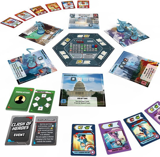 This expansion brings an entirely new way of playing Marvel United! The Civil War play modes make it a true Player vs Player game, in which two teams of Heroes clash against each other, with no Villain in sight. Featuring a roster of Heroes from both sides of the Registration conflict, this expansion brings two ways for players to fight each other: either the more casual Clash of Heroes, or the more competitive, asymmetrical, and thematic Registration Clash! Which team will you choose?