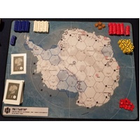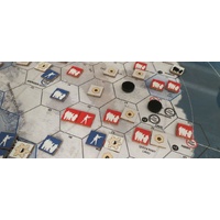 In Meltwater, two players take command of the shattered remains of the superpowers, struggling for control of the ice. Simple diceless mechanics let players displace, corner, and isolate their opponent’s survivors. Here, hunger is a crueler weapon than gunfire, and the barren tundra can only support so many souls. And every turn, radioactive contamination pushes in from the coastline, shrinking the available space and forcing the belligerents closer and closer together.
