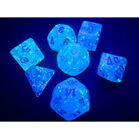 Contains 7 Luminary Sky Dice with silver numbers in the following Shapes: