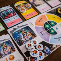 Moon Colony Bloodbath is an engine-building, engine-losing tableau game, with a shared deck the players build that makes things happen, many of them bad things that kill people in your moon colony, but some positive, and some that let you build up.