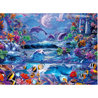 Experience the enchantment of the night with the Ravensburger Moonlit Magic Starline Jigsaw Puzzle 500pc. This captivating puzzle invites you to assemble a serene nocturnal scene featuring frolicking dolphins, soaring gulls, and a luminous lighthouse, all under the glow of the moonlight. As part of Ravensburger's renowned Starline series, this puzzle offers a unique twist: select elements of the completed image glow in the dark, adding an extra layer of magic to your puzzling experience.