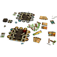 In this 2-player game, each player moves around their own temple, which has spaces for room tiles and hiding places for 9 sacred and cursed relics. These relics are placed randomly, facedown, around the temples and are worth victory points once flipped face up.