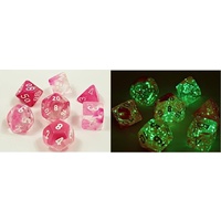 Chessex Luminary Dice are mixed with glow in the dark flecks inside their translucent bodies. After charging under lights, your magic math rocks are full of stars in dim light.