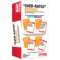 Overrated is the game of ridiculous reviews where players compete to match the funniest “Review” card with the “Location” card for each round. Players rotate drawing a Location card while the rest of the group competes to play the funniest Review card. Once everyone has played their chosen Review card, the rotating judge awards a point to the funniest one. The player with the most points at the end of the game takes the crown. Brought to you by the creators of What Do You Meme.