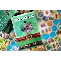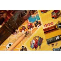 In this flip-and-write game, you use poker cards to extend your railway tracks and build a poker hand at the same time. Each turn, you choose one of the revealed poker cards. The suit of the card helps you extend your railway, connecting you to new towns and surrounding features. When you connect to a town, you gain the ability to do a one-time bonus. When you surround a feature with your tracks, you activate it for endgame scoring. The value of the card is added to your poker hand, for which you'll score additional points at the end of the round.