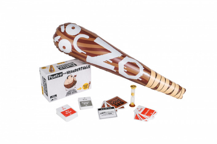 Poetry for Neanderthals is a family-friendly party game similar to Taboo where players earn points by getting their teammates to guess words and phrases. The catch is that the "Neanderthal Poets" are only allowed to use single syllable words. If they use any words with more than one syllable, the other team gets to bop them with a 2-foot inflatable club. The team with the most points wins!