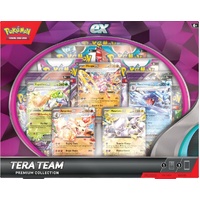 Each Tera Team Premium Collection showcases a themed team of three Pokémon ex, united by type and strategy. Featuring crystal-style Tera Pokémon with unique abilities and high-damage attacks, these cards bring both strength and visual impact to your game.