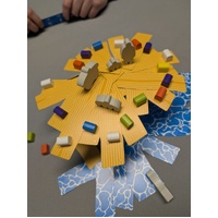 On a turn, lift a rafter, place a raft card on the playing area, replace the rafter, then place one of your treasure chests somewhere on the raft...ideally in a precarious position because if someone else knocks off this chest, they must keep it in their hold. If a player collects five treasure chests owned by other players in their hold, they're out of the game! (You can knock off your own chests without penalty, but you're making the game easier for everyone else.)