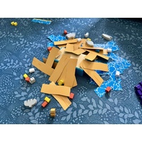 To start, stack the box top and bottom to create a base, then place the five wooden rafter pieces on the starting card on top of the base.