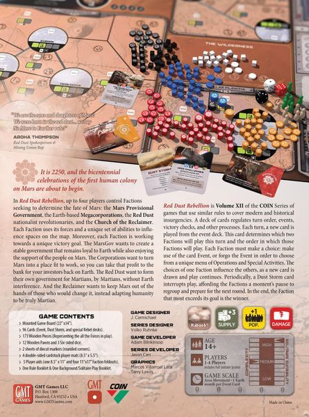 Red Dust Rebellion is volume XII of GMT's acclaimed COIN Series, and tells the story of the Martian revolts of the 2250’s and the rise of Martian nationalism.