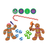 ROLL for Your Life, Candyman! is a frantic, real-time dice fest of gingerbread cookie combat in which 2-4 players face off in arena-style, free-for-all battles, rolling their dice like crazy. When a player gets all four of their dice to match, they grab the plastic candy cane at the centre of the table, stopping the action and claiming an opponent's limb that matches the die result. Losing all of your "puzzle-board" limbs eliminates your from the round — but fear not, it is the player at the end of three rounds who has collected the most cookie parts that wins the day!