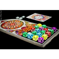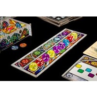 In more detail, each player builds a stained glass window by building up a grid of dice on their player board. Each board has some restrictions on which color or shade (value) of die can be placed there. Dice of the same shade or color may never be placed next to each other. Dice are drafted in player order, with the start player rotating each round, snaking back around after the last player drafts two dice. Scoring is variable per game based on achieving various patterns and varieties of placement...as well as bonus points for dark shades of a particular hidden goal color.