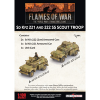 Write a reviewSd Kfz 221 and 222 SS Scout Troop includes two resin and metal Sd Kfz 222 (2cm) Armoured Cars, one Sd Kfz 221 Armoured Car and one Unit card.