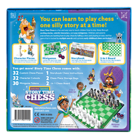 Write a reviewStory Time Chess is a board game that teaches chess to young children using silly stories, vibrant illustrations, custom chess pieces, a unique chess board, and an engaging card game. The stories and supporting materials communicate the rules of chess to children ages 3 and up in a way that makes learning chess simple and fun. Best of all, no chess experience is required for parents or children to learn.